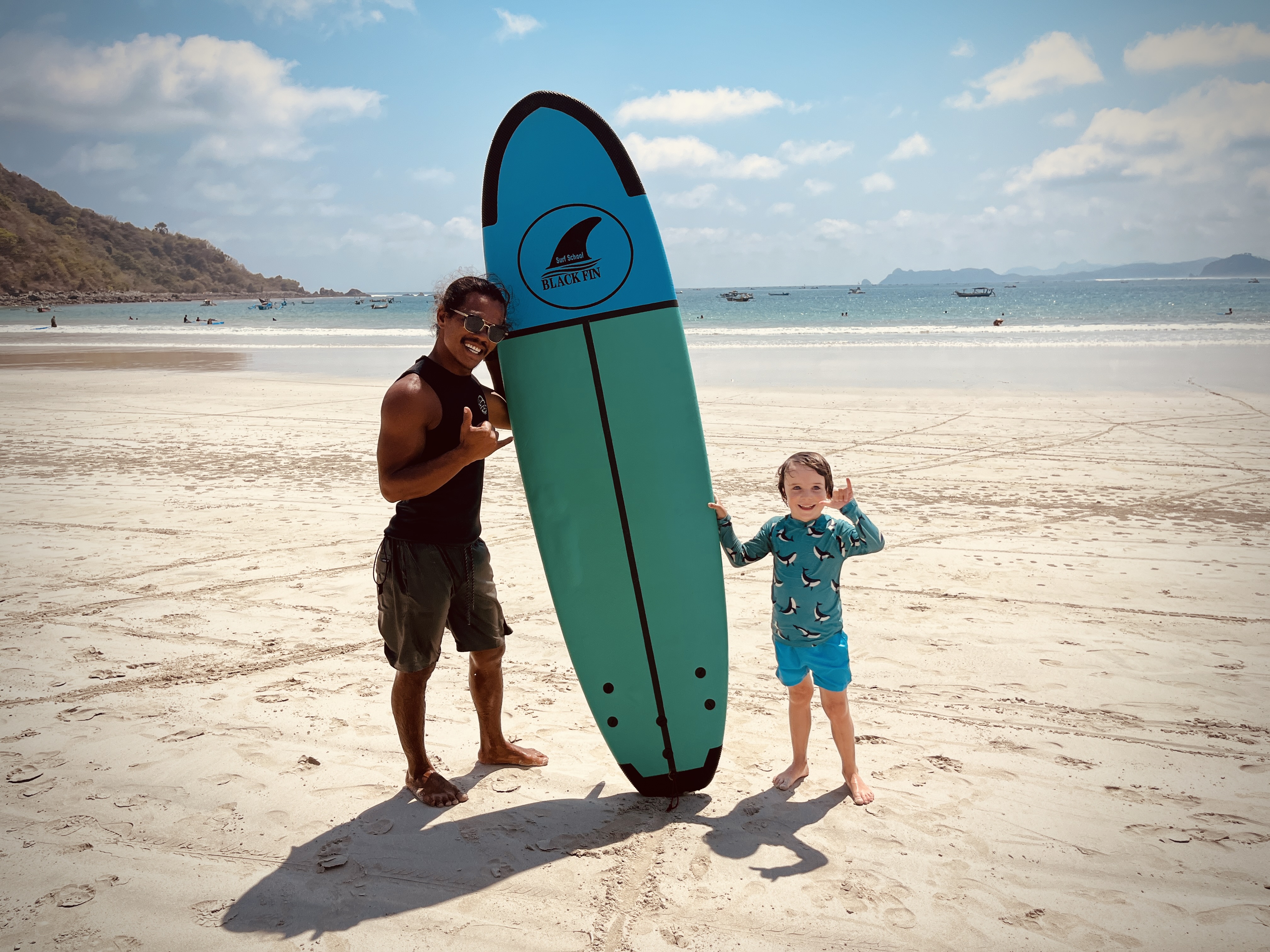 If you’re looking for surf lessons you can’t do better than Sandy, the owner at Black Fin Surf School. He had first Finn and then Steffi standing up in no time, and he can also sort you out with beach chairs and umbrellas if you prefer relaxing on the beach.